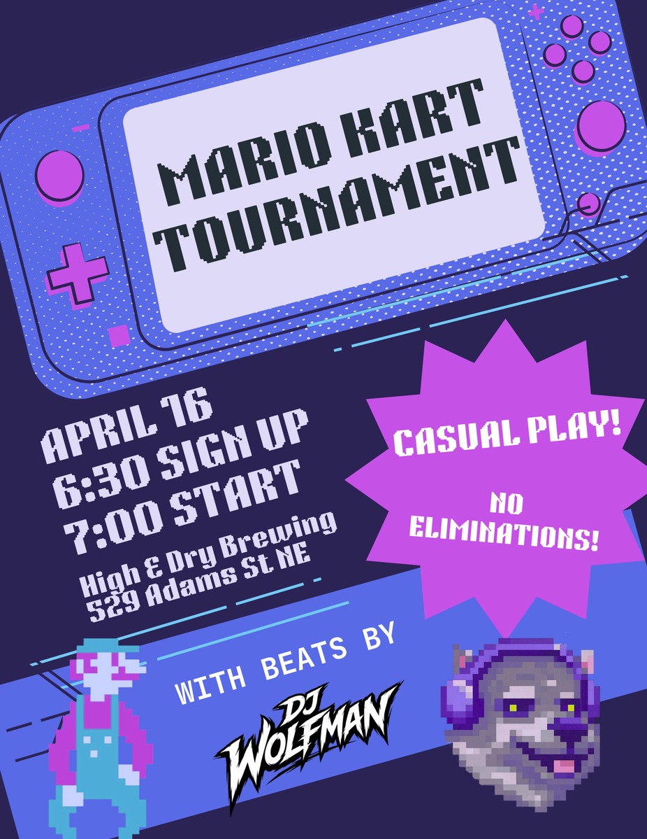 Join us for a night of casual Mario Kart tournament play at High & Dry Brewing! No eliminations — just good races, good vibes, and cold beer.