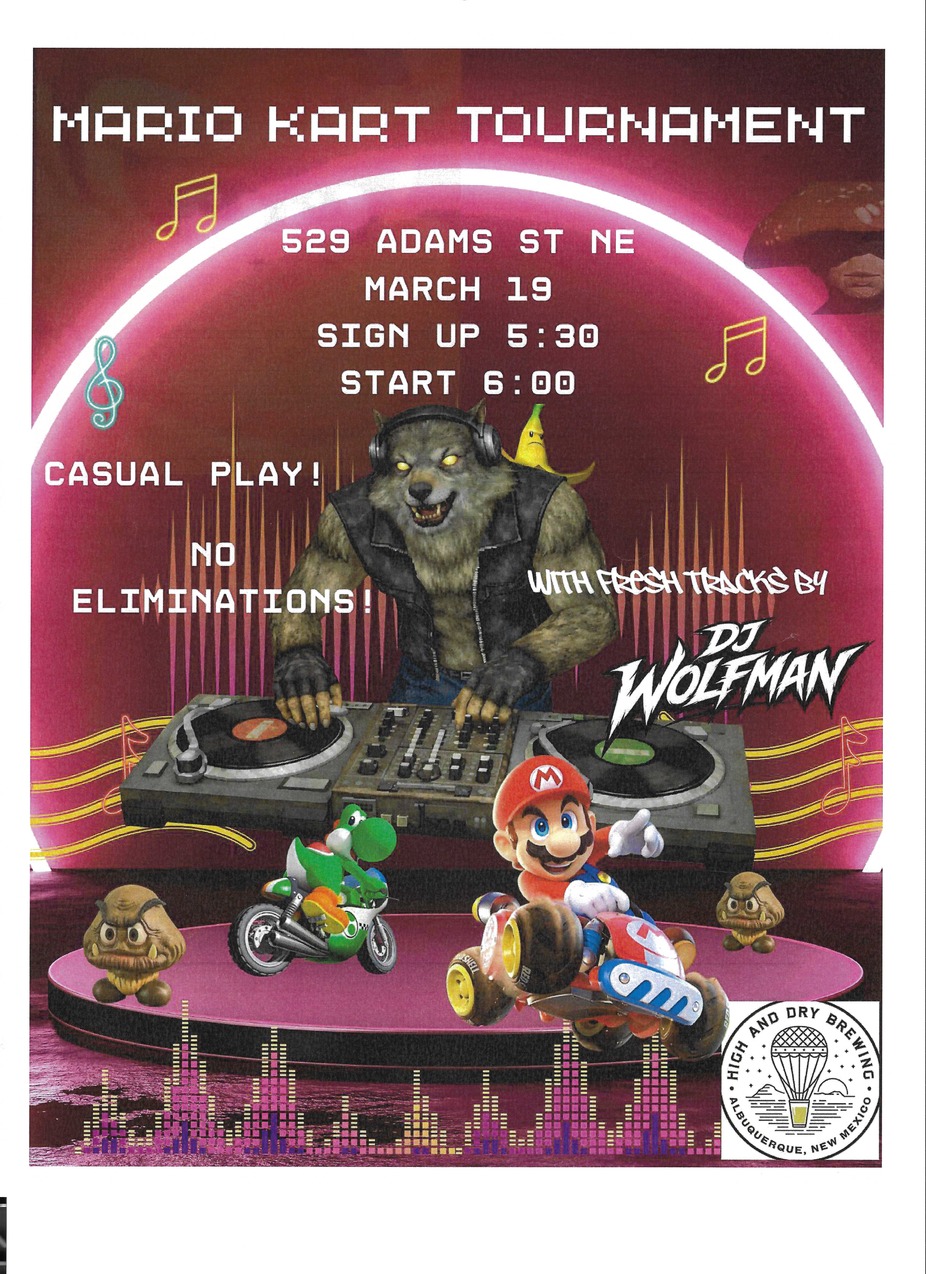 Grab your kart and head to High & Dry for a night of friendly competition! We're running a casual, points-based tournament — no eliminations, so everyone races all night. The top 4 point earners at the end will face off in a full cup series to crown the ultimate champion. Come for the racing, stay for the beer — and DJ Wolfman will be spinning tracks all night to keep the vibes going.